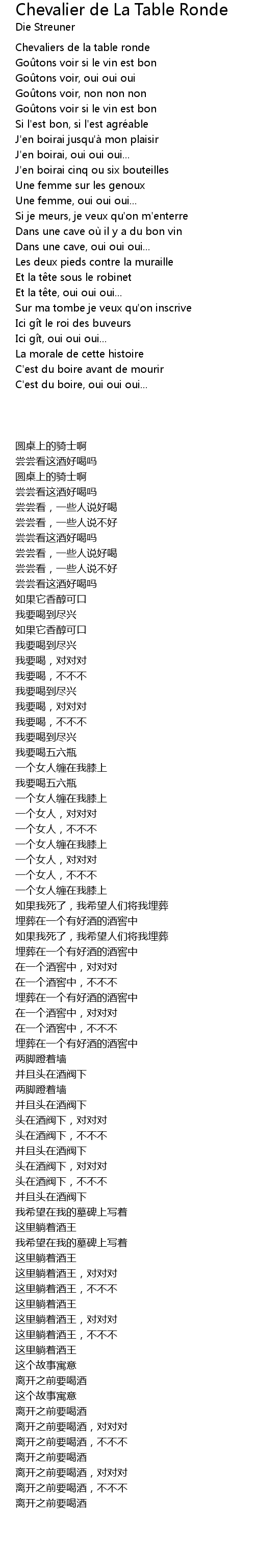 Página inicial c chansons à boire chevaliers de la table ronde. La rondeur de la table est le symbole majeur de l'égalité et de la fraternité entre les chevaliers. Le roi arthur réunit autour de la table ronde ses chevaliers les plus vaillants (courageux), toujours à la recherche de l'aventure qui leur permettra de mettre en avant leur bravoure. Französisch (vielen dank an rosesenpai) chevaliers de la table ronde goûtons voir si le vin est bon goûtons voir, oui oui oui goûtons voir, non non non goûtons voir si le vin est bon. Follow chevalier de table ronde and others on soundcloud.